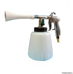 Оснащен гибкой пластиковой трубкой малого диаметра, вращающейся посредством сжатого воздуха, через которую распыляется моющая жидкость, что позволяет быстро удалять загрязнения различного происхождения с ткани, велюра, винила и пластика. Устройство без подшипника. Идеально подходит для очистки обивки сидений и потолка автомобиля. Позволяет выполнять работы по экспресс химчистке на автомойках и автосервисах. Оснащено регулятором расхода химии.