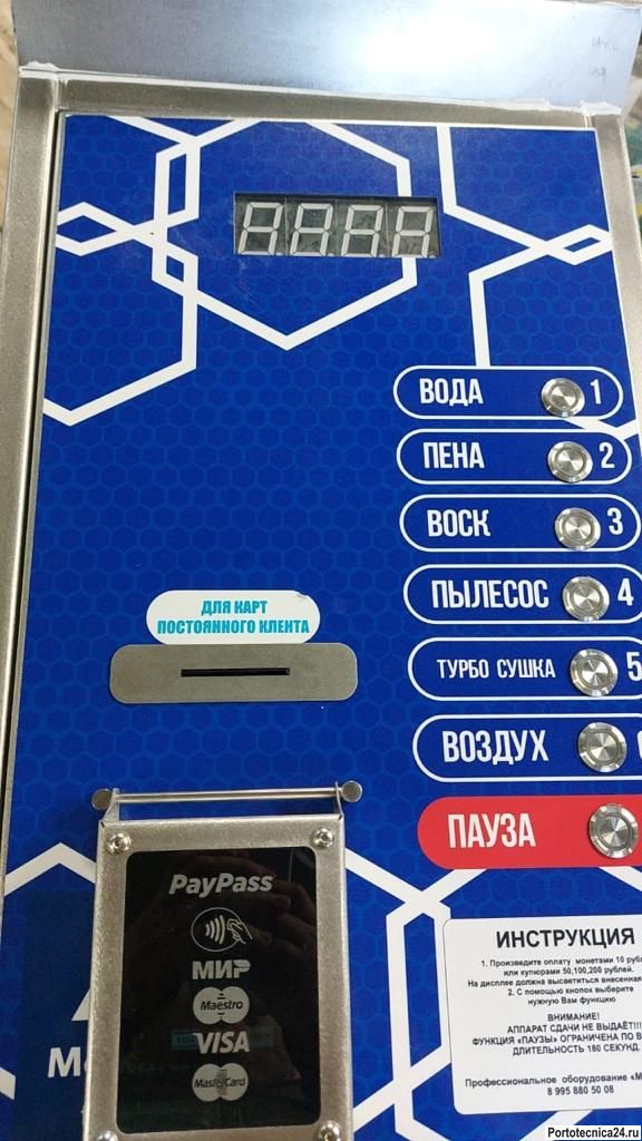 1. Электродвигатель Мощность - 5,5 кВт; Напряжение - 380 V; Об/мин - 1450; Тип вала - полный вал 2. Помпа Comet (с регулятором ) Италия; Поток воды 840 л/ч; Рабочее давление 200 бар; 3. Пульт управления с купюроприемником (Cash Code или ict A7), монетоприёмник (eu9 или eu2) из нержавеющей стали на 12Вт, влагозащищенный, с антивандальными металлическими кнопками. 4. Консоль потолочная 360 градусов z-образная из нержавеющей стали (Италия) - 2шт. 5. Шланги от консоли до пистолета 5 метров -2шт. 6. Пистолет st 2300 (Германия) для воды, длина 50см, вход 3\8 вращ.- выход 1\4. - 1шт. 7. Пистолет st 2300 (Германия) для пены, длина 30 см, входное отверстие форсунки 1\2 - 1шт. 8. Колчан напольный, из нержавеющей стали - 2шт. 9. Дозатор пена-1 шт. 10. Силовой блок управления с реле 12вт. 11. Крепежи для ковриков из нержавеющей стали - 4шт.