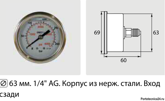 Описание товараМанометр вход сзади 1/4"ш; Д 63мм; 0-1000 бар (нерж)Характеристики