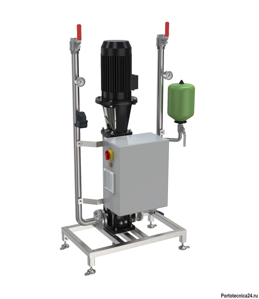 Используемый вертикальный насос повышения давления отличается коррозийной стойкостью, бесшумной работой, высокой эффективностью и компактной конструкцией. Комплект автоматики обеспечивает поддержание стабильного давления на всех потребителях – сателлитных станциях, независимо от того, какое их количество задействовано в моечно-дезинфицирующих работах в данную минуту. Датчик контроля входного потока - защита от сухого хода и Датчик контроля температуры, подадут сигнал на отключение насоса, в случае падения давления воды на входе ниже минимального и превышении максимально допустимой температуры, тем самым, они сберегут насос от серьезной поломки.