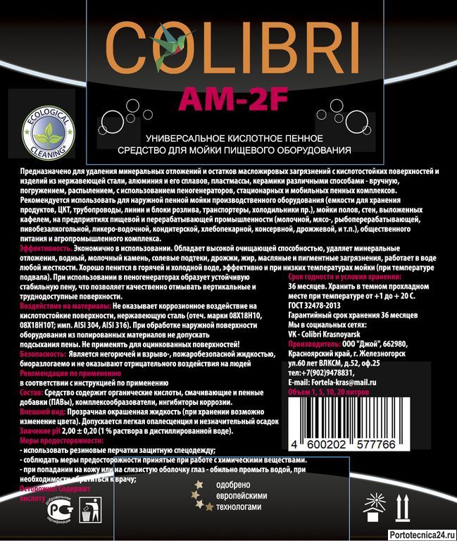 Кислотное пенное средство. Предназначено для удаления минеральных отложений и остатков масложировых загрязнений с кислотостойких поверхностей и изделий из нержавеющей стали, алюминия и его сплавов, пластмассы, керамики различными способами - вручную, погружением, распылением, с использованием пеногенераторов, стационарных и мобильных пенных комплексов. Рекомендуется использовать для наружной пенной мойки производственного оборудования (емкости для хранения продуктов, ЦКТ, трубопроводы, линии и блоки розлива, транспортеры, холодильники пр.), мойки полов, стен, выложенных кафелем, на предприятиях пищевой и перерабатывающей, общественного питания и агропромышленного комплекса.