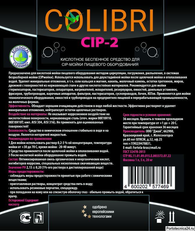 Кислотное беспенное средство. Предназначено для кислотной мойки пищевого оборудования методом циркуляции, погружения, распыления, в системах безразборной мойки (CIPмойки). Используется для двухстадийной мойки после щелочной мойки и ополаскивания водой. Удаляет минеральные отложения, в т.ч. соли кальция и магния, накипь, молочный камень, остатки протеинов, жиров, дрожжей с поверхностей из нержавеющей стали и других кислотостойких материалов. Рекомендуется для мойки стерилизаторов, пастеризаторов, сепараторов, нагревателей, испарителей, резервуаров, емкостей, доильных установок, фризеров, трубопроводов, варочных аппаратов, фильтров, пастеризаторов, суслопроводов, бочек, КЕГов. Применяется для мойки технологического оборудования, емкостей и трубопроводов на предприятиях пищевой и перерабатывающей промышленности, на молочных фермах.