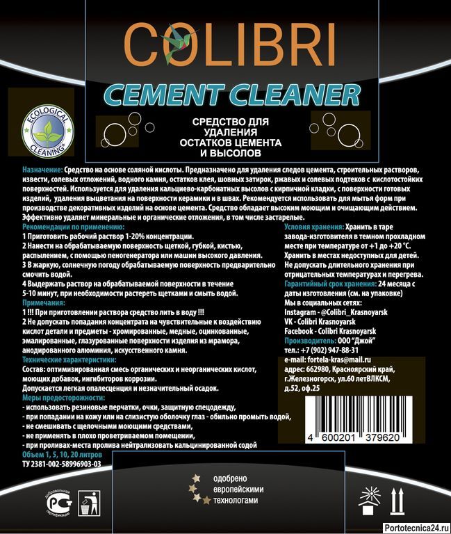 Средство предназначено для удаления следов цемента, строительных растворов, извести, солевых отложений, водного камня, остатков клея, шовных затирок, ржавых и солевых подтеков с кирпичной кладки, бетона, керамической плитки, гранита и других кислотостойких поверхностей.