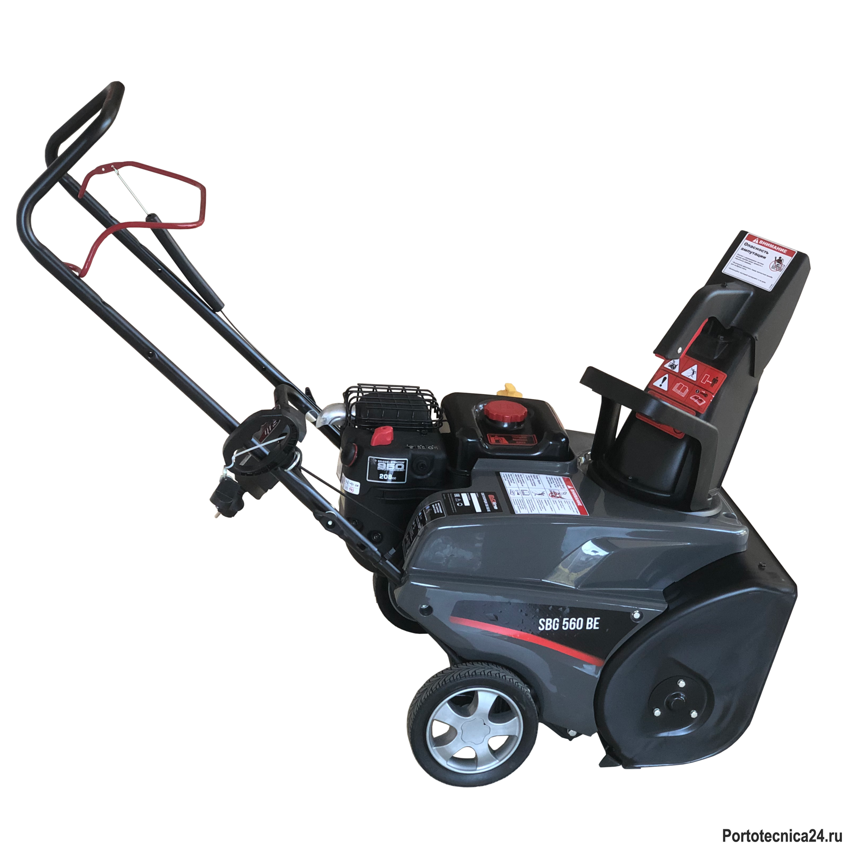 одель EVOline SBG560BE имеет в стандартной комплектации легкий запуск двигателя от розетки 220В, складную рукоятку, корпус из ударопрочно пластика и транспортировочные колеса.